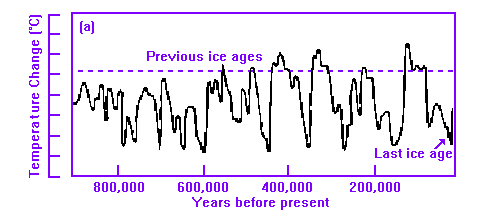 Ligne médiane à 15°C, les glaciations résultent d'une baisse de 5°, les cycles de 100 000 ans sont reliés aux changements de l'orbite terrestre (et donc à l'ensoleillement).