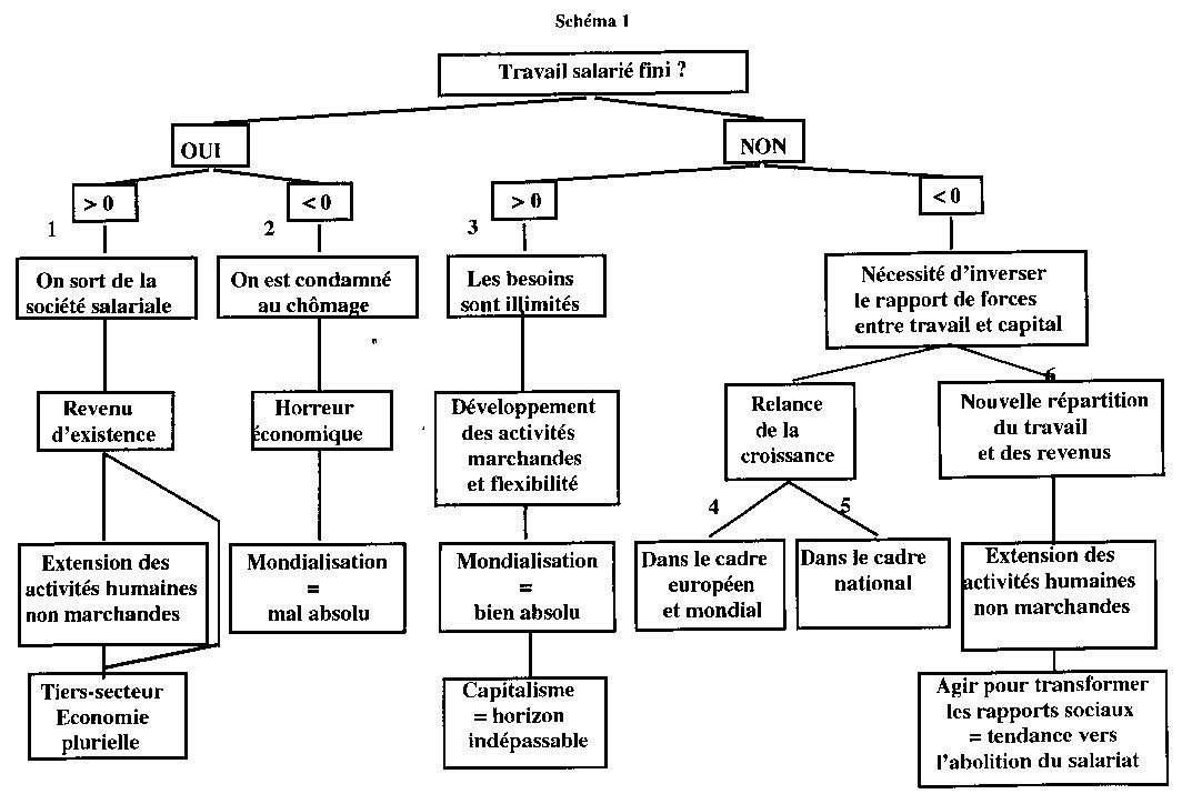 Ces trois conceptions ont une influence sur le pronostic porté sur l'avenir du travail. Les deux premières se rattachent à une vision anthropologique du travail dont on peut conclure sans grand risque de se tromper que le travail est d'essence humaine et que le besoin d'agir et de créer durera autant que l'homme. La troisième conception se laisse moins facilement décortiquer: elle signifie que le travail salarié est totalement lié aux rapports sociaux capitalistes, mais, à partir de là, les analyses et les propositions divergent radicalement. L'arborescence du schéma 1 permet de discerner plusieurs voies selon que la fin du travail salarié est envisagée de manière positive ou négative.