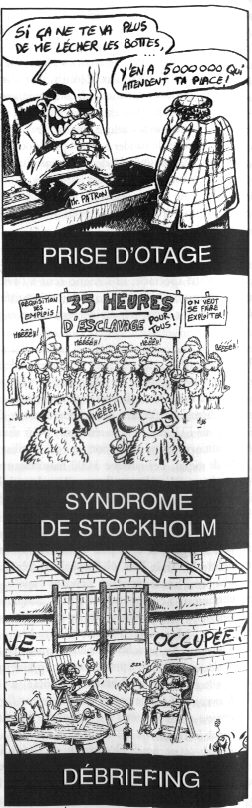 Car jusqu'ici la figure alarmante du chômeur a été instrumentalisée en terrorisme social par le système capitaliste afin faire accepter n importe quel boulot même le plus absurde, à n'importe quelles conditions. Et pourquoi ne pas créer des emplois de cireurs de pompes 10 heures par jour, 7 jours par semaine pour 2 F de l'heure? ....