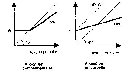 - soit fournir à ceux qui ne satisfont pas cette condition la différence entre le niveau G et leur revenu primaire, c'est le système de l'allocation complémentaire;